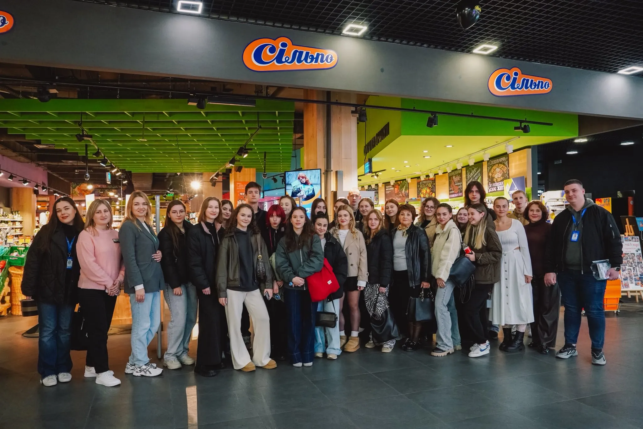 Під час екскурсії студенти зустрілися з менеджеркою з персоналу Тетяною Волобуєвою та HR-навігаторкою ТОВ «Сільпо» Сільпо Наталією Ковальовою. Представниці компанії розповіли про організацію роботи мережі, основні підходи до управління та розвитку, критерії відбору продукції та формування асортименту. Учасники також ознайомились із внутрішніми процесами супермаркету та виробництвом власної продукції хлібобулочної, кондитерської, сирної, м’ясної та рибної, а також із лінійкою крафтових товарів українських виробників.
