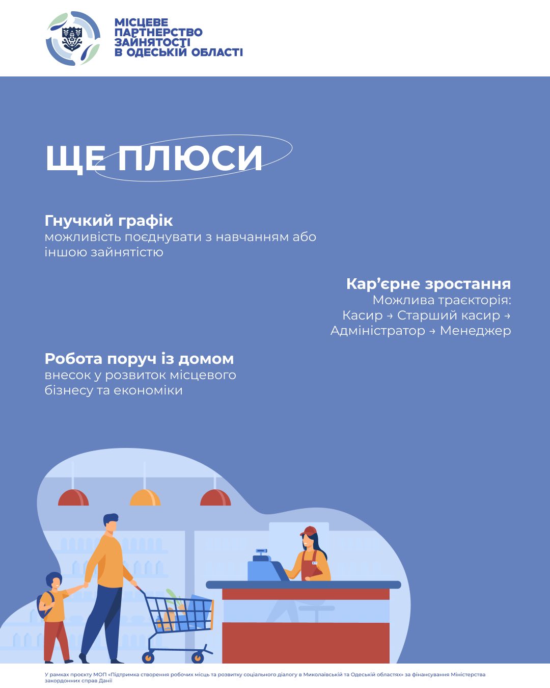 В рамках Ініціативи Місцевого партнерства зайнятості (МПЗ) в Одеській області в рамках Проєкту Міжнародної організації праці «Підтримка створення робочих місць в Миколаївській та Одеській областях та розвиток соціального діалогу» за фінансування Міністерства закордонних справ Данії.